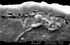 | Bild 6: Vergrößerung (3000fach) der Randschicht einer buntgehärteten Oberfläche (Querschnitt) | Bild 7: Vergrößerung (5000fach) einer buntgehärteten Oberfläche (Draufsicht) |