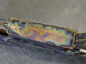 Die im Verlaufe meiner mehrjährigen, wissenschaftlichen Forschungsarbeit am Institut für Materialwissenschaft und Werkstofftechnologie der Friedrich-Schiller-Universität in Jena gewonnenen Erfahrungen zum Bunthärten entstanden aus umfangreichen Untersuchungen zu diesem Verfahren. Dabei wurden verschiedene analytische Methoden zur Charakterisierung der Oberflächen von Stahlwerkstoffen eingesetzt und das geometrieabhängige Verzugsverhalten an konkreten Bauteilen getestet. Gleichzeitig konnte ich Verschlussteile mit originalen Bunthärtungen metallographisch untersuchen und dabei Rückschlüsse auf die traditionellen Verfahrenstechnologien ziehen. Insofern war festzustellen, dass auch nicht alle früher gehärteten Teile optimale Farbnuancen aufweisen und selbst erfahrene Bunthärter mit Qualitätsschwankungen leben mussten, da die physikalisch-chemischen Grundlagen des Verfahrens noch nicht genau bekannt waren (Bild 7+8).